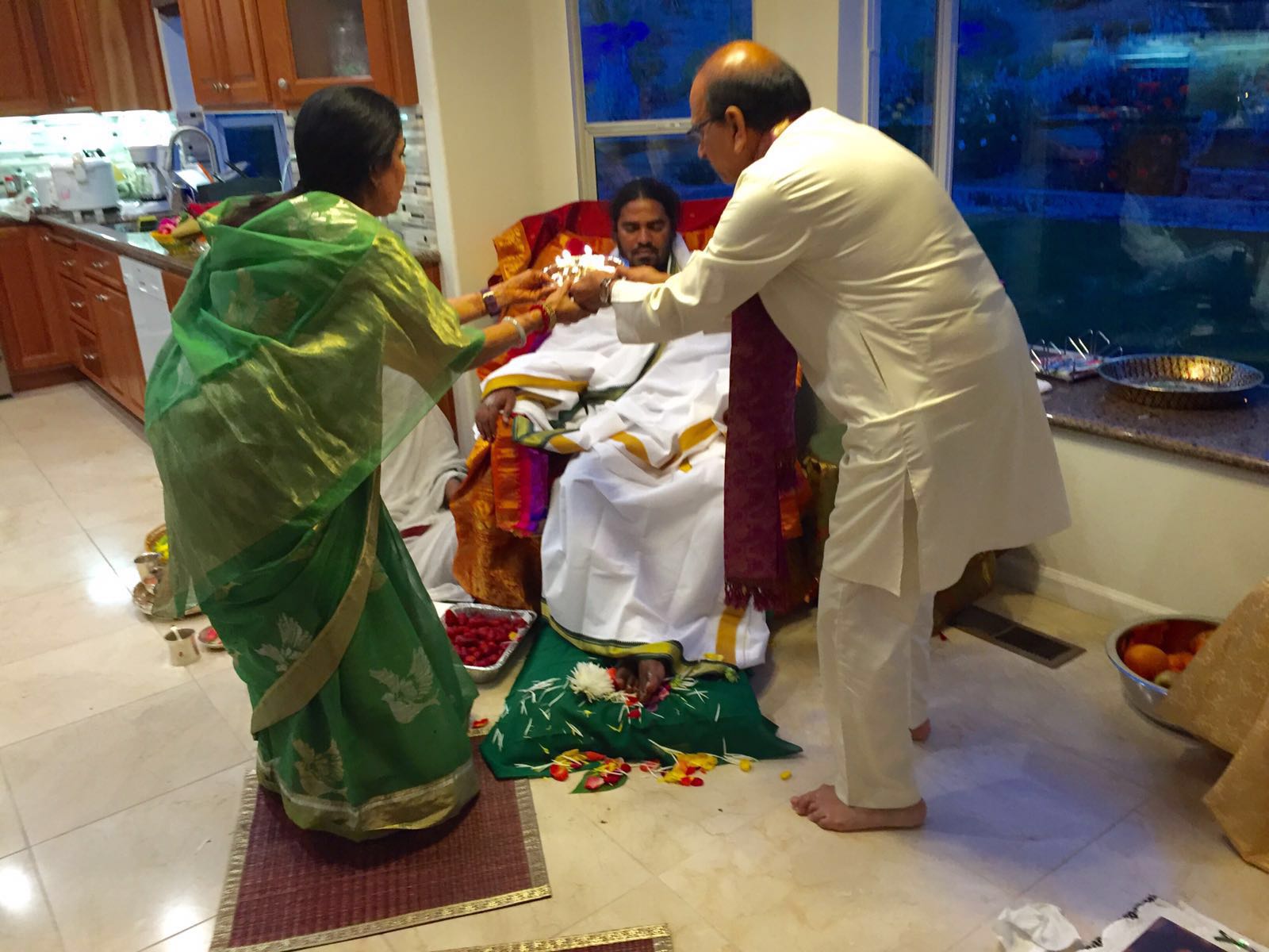 April 12, 2016 PM — Sri Srinivas Pyda’s home at Livermore, California; as they say “meanwhile back at the ranch”… Amma was welcomed with Poorna Kumbham by Sri Srinivasachari garu, along with Smt. Lakshmi Pyda (Sri Srinivas Pyda’s sister-in-law), and few other devotees.